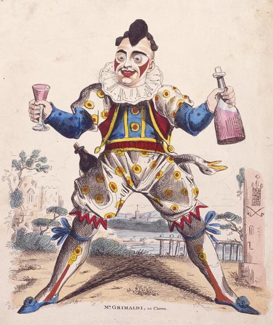 There was a time when the harlequin in the theatre plays, was just just “the fool”, and was never the main character. At least not until Joseph Grimaldi invented the harlequin with the face of what we know today as a clown. He was so successful that the clown became to be the character that the audience was going to the theatres. He is the one who invented the make-up of the clown as we know it today.