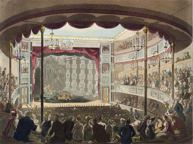 The rebuilt Covent Garden Theatre (later renamed the Royal Opera House) in 1828; Grimaldi started a long collaboration with the theater in 1806.