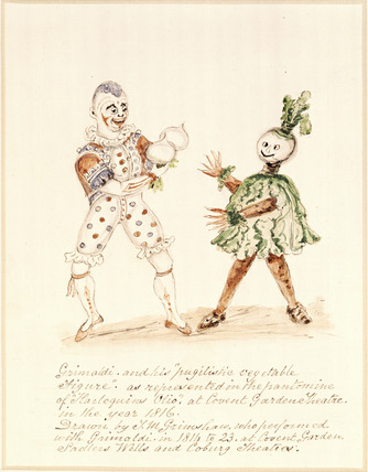 Grimaldi as Clown opposite an actor playing a “pugilistic vegetable” at the Covent Garden Theatre, 1816.