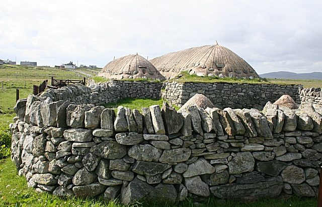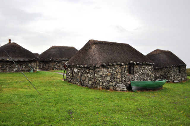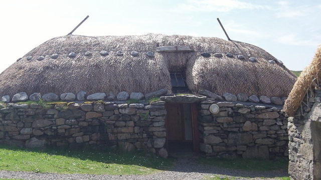 The buildings were generally built with double wall dry-stone walls packed with earth, often laid in parallel to other blackhouses, and were roofed with wooden rafters covered with a thatch of turf with cereal straw or reed. These blackhouses were used to accommodate livestock as well as people. People lived at one end, and the animals lived at the other with a partition between them. Part of the blackhouse was also used as a barn for storage and processing of grain and other products.