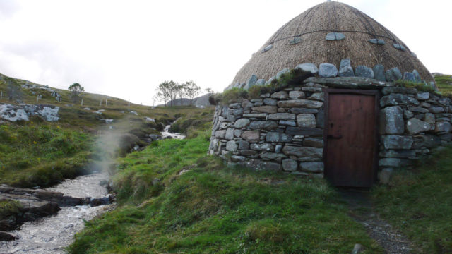 One of the best places to see blackhouses is at the Isle of Lewis, in the Outer Hebrides. Although the Lewis blackhouses have a look of real antiquity, most of the upstanding ruins were built less than 150 years ago. The Lewis examples have clearly been modified to survive in the tough environment of the Outer Hebrides. Low rounded roofs were developed to resist the strong Atlantic winds and thick walls to provide insulation and to support the sideways forces of the short driftwood roof timbers.