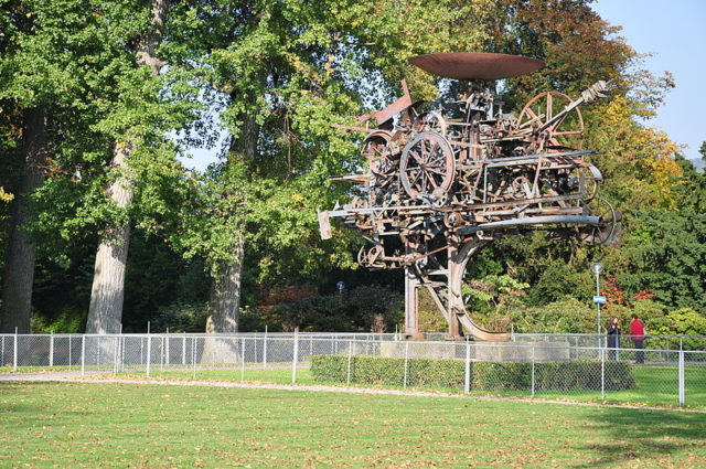 Tinguely was famous for his sculptural machines or purposeless kinetic artworks, known officially as meta-mechanics in the Dada tradition, which challenged the norms of bourgeoisie high society. The title, “Heureka,” is Ancient Greek for “I’ve got it!” but this is meant to be ironic. His art satirized the mindless overproduction of material goods in advanced industrial society. The kinetic sculpture represents a machine which has no purpose; The machine churns and churns in aimless absurdity.