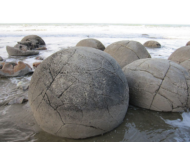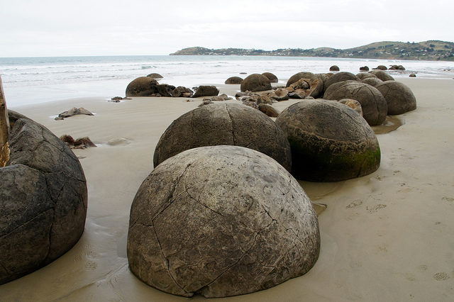 The Moeraki Boulders are unusually large and spherical boulders on Koekohe Beach near Moeraki on New Zealand’s Otago coast. They originally formed on the sea floor when the mudstone was accumulating during the early Tertiary period, some 60 million years ago. The relentless pounding of waves over millennia has gradually eroded the softer sediment and uncovered the compacted spherical stones.