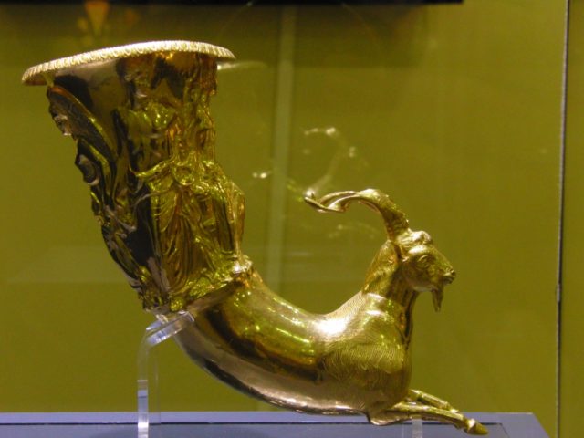 Four of the vessels are rhytons, they are shaped like female and animal heads, two of which are of fallow deer and one is like a ram’s head. They are often described as wine cups used by the Thracians but, a rhyton is,in fact, a ritual cup for sanctifying wine.
