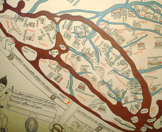 It was drawn in black ink, with additional red and gold on a single sheet of vellum, it measures 158 cm by 133 cm. It depicts 420 towns, 15 Biblical events, exotic plants and animals, 32 people, classical myths, and wild and strange creatures. The map could only be read by people who spoke Norman French, the language of the literate secular elite.
