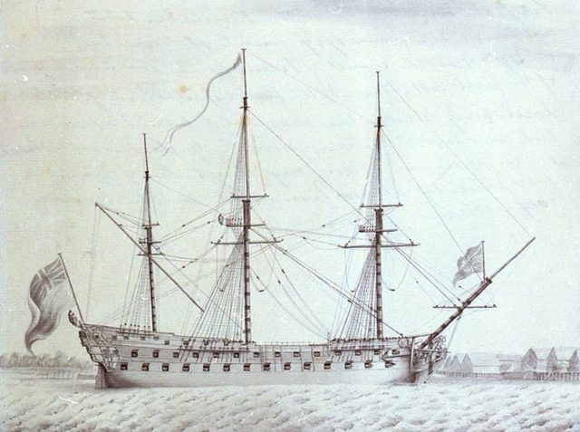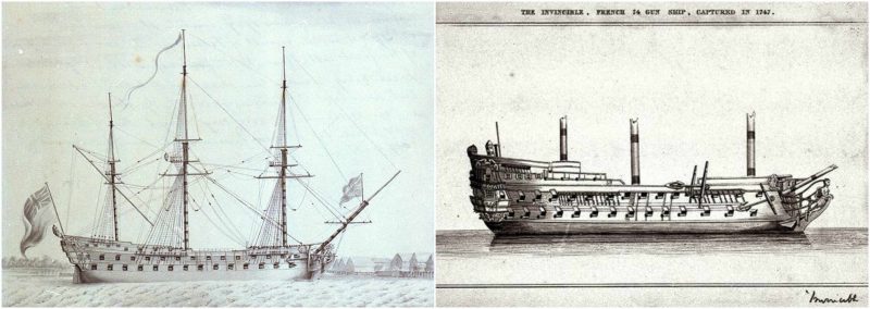The ship had two decks and a crew of over 700 soldiers, and was originally built for the French navy as L’Invinciple. In 1748, she was captured by the Royal Navy and her name was Anglicized to Invincible.