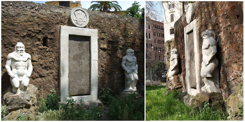 The portal is flanked by two seemingly bizarre statues with short, stout legs and a grotesque bearded face representing a real Egyptian deity called Bes. Originally, the statues did not belong to Villa Plamobara. They were found somewhere near the Quirinal Hill, where a temple once stood in ancient times, dedicated to the Egyptian gods Isis and Serapis. These statues were moved to the Porta Alchemica from their original location in 1888.