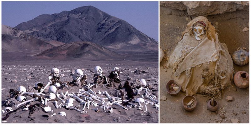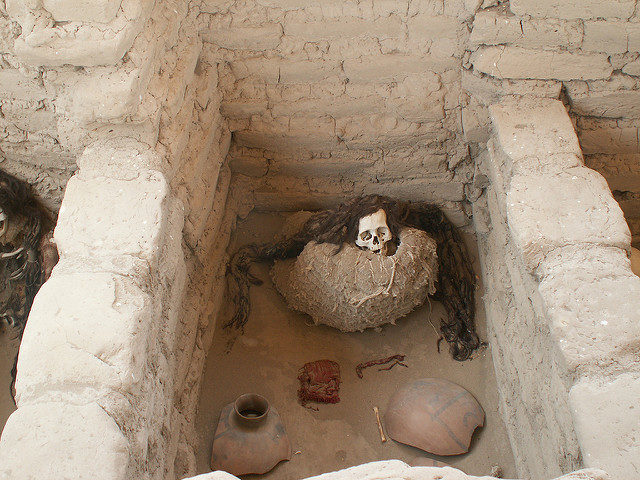 The bodies are so remarkably preserved, due mainly to the arid climate in the Peruvian Desert. In addition to skulls and bones, there are several tombs which are centuries old, as well as long human hairs, ceramic fragments and other remains scattered on the desert surface. The bodies were clothed in embroidered cotton and then painted with a resin and kept in purpose-built tombs made from mud bricks. The mummies are sitting upright; they are all facing east as required under the faith of the Nazca people.
