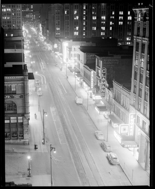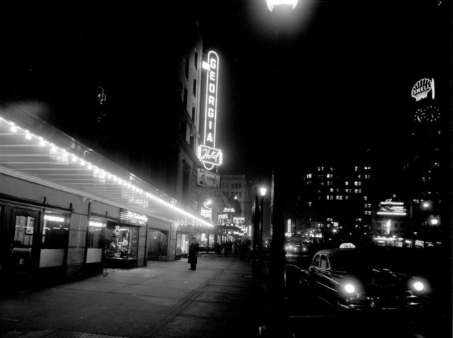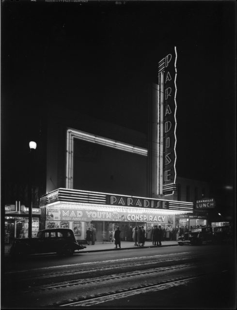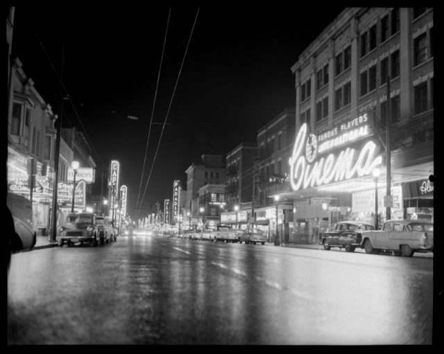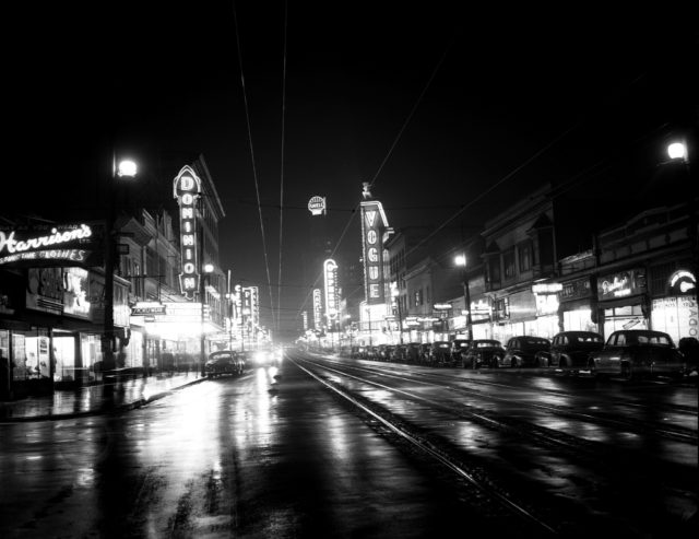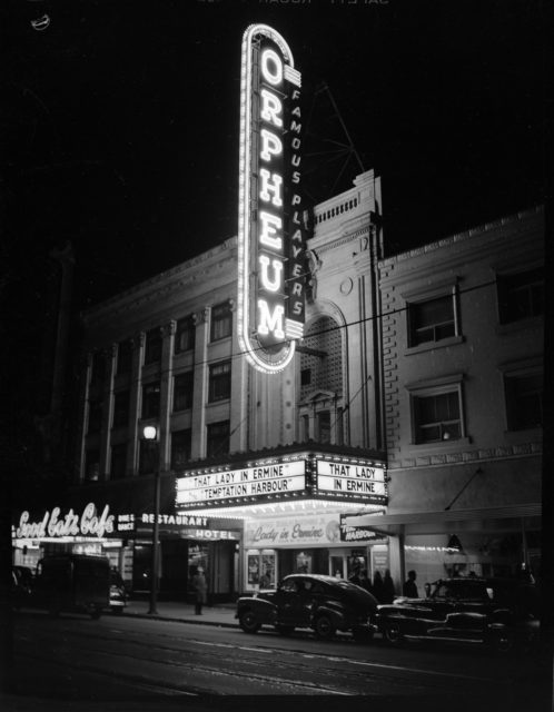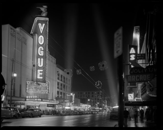 In the mid-twentieth century, the Downtown area of Granville Street became a huge center for entertainment, recognisable by its cinemas and theaters built along the so-called “Theatre Row.” The street was flourishing, with many landmarks such as restaurants, clubs, the Vogue and Orpheum theatres and many other.