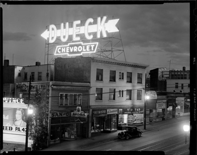 Granville Street is one of the major streets in Vancouver. It runs in a north-south direction through the center of Vancouver, passing through several neighborhoods and commercial areas. During the 1950s, Granville Street attracted many tourists to one of the world’s largest displays of neon signs.