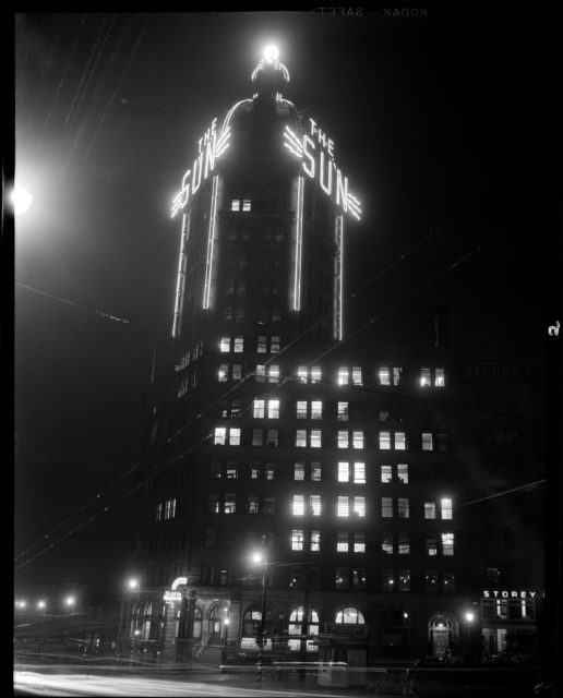 When the Sun Tower was completed in 1912, it was called the World Building and was the tallest building in the British Empire at 82 m (269 ft), surpassing the previous record-holder, the Dominion Building, which was located just around the corner.