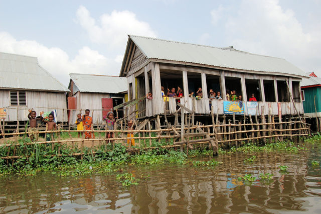 The village school is one of the few buildings not on stilts. Residents are currently bringing soil onto the lake to make a second island, which will serve as a cemetery.
