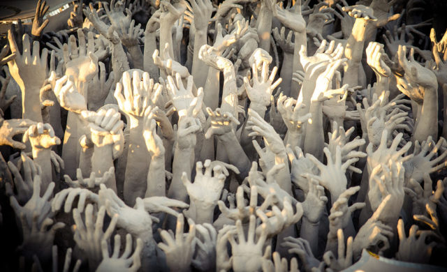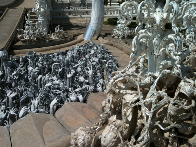 The principal building or Ubosot is an all-white building with fragments of mirrored glass embedded in its exterior. The white color signifies the purity of the Buddha, while the sparkling glass symbolizes the Buddha’s wisdom and the Dhamma, the Buddhist teachings. All around the complex are intricate sculptures of demons, skulls, severed heads hanging from trees and other bizarre objects.