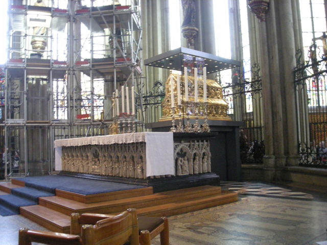 It is a large gilded and decorated triple sarcophagus placed above the high altar of Cologne Cathedral.
