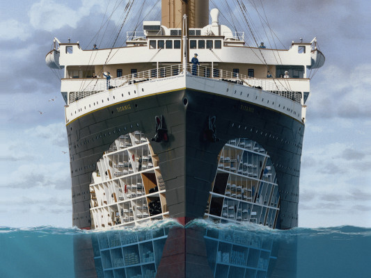 At about 11:40 pm, lookout Fredrick Fleet spotted an iceberg directly ahead of the Titanic, but with a calm sea at night it took too long to identify, and the ship could not stop in time. The First Officer ordered the ship to turn, but such a large ship has a long reaction time; the turn took too long, and the ship’s starboard side scraped along the underwater portion of the iceberg, which punched holes in the hull below the water line. The watertight compartments failed because they were not tall enough and acted like an ice cube tray, gradually filling one after another as the ship started to list.