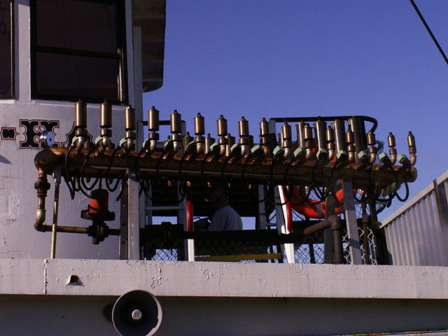It works on steam or gas and more recently, compressed air, which is sent through large whistles that were originally locomotive whistles.