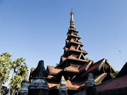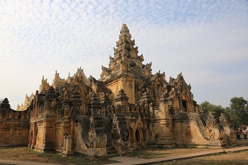 The picture above displays the Maha Aung Mye Bon San Monastery, which is a fine example of Burmese monastery architecture during the Konbaung dynasty. The monastery, also known as the Brick Monastery is a well-preserved building in ochre color. The very ornate structure is decorated with intricate stuccoed sculptures.