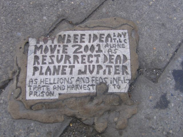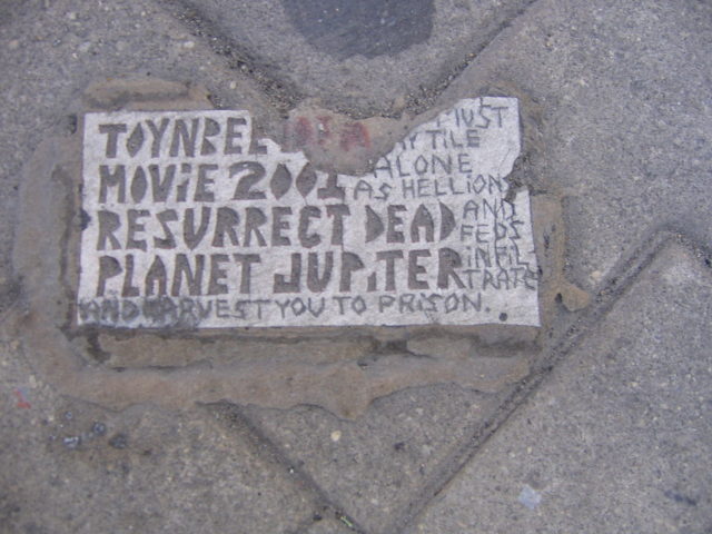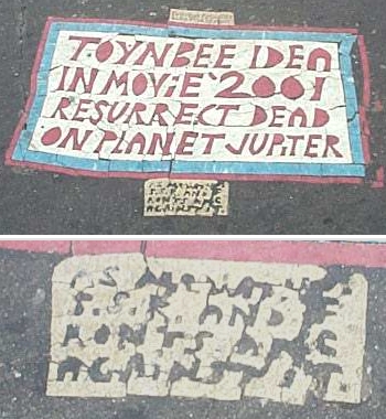 The mystery of the so-called “Toynbee Tiles” began in the mid-1980s when they started to appear on the streets of Philadelphia. The tiles usually contained a variation of the following message: TOYNBEE IDEA / IN MOVIE `2001 / RESURRECT DEAD / ON PLANET JUPITER. At first, only a few people noticed them, but as they began to appear all over the country, the curiosity about them grew. The first article on this subject, titled “The word on the street turns cryptic,” appeared on October 19, 1994, in The Baltimore Sun: