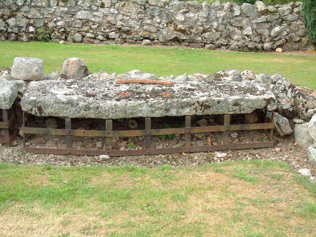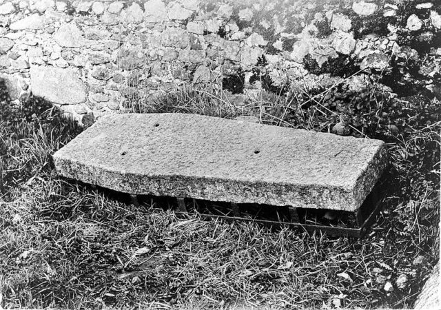 The Mortsafes in Cluny kirkyard date to the early 1800s and consist of a large granite slab with an iron cage.