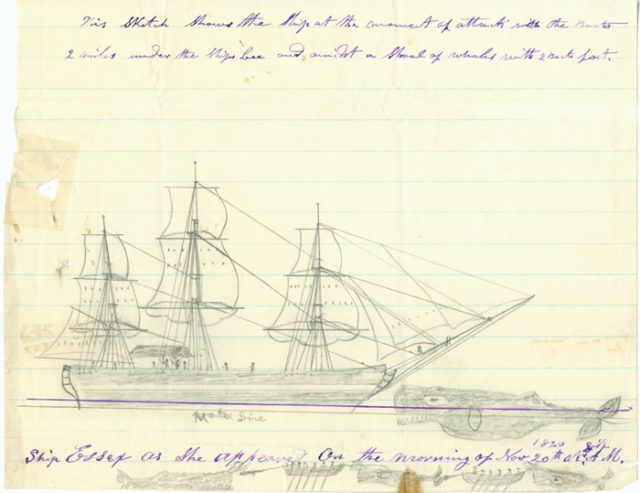 Chase had been repairing the whaleboat that was damaged while on board the Essex. The crew sighted an abnormally big whale (that was reported to be about 85 ft) which was acting strangely. It was laying motionless on the surface and facing the ship.