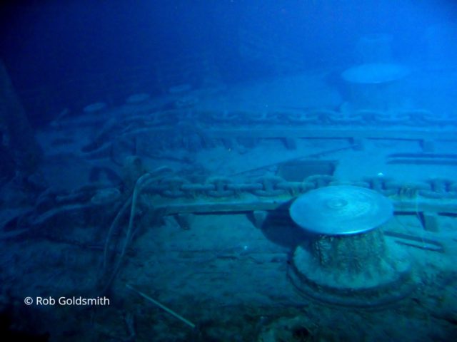 We then made our way over the bow to the forecastle. As we skimmed along the deck, I couldn’t believe how well preserved this area of the ship was, the capstans and bollards were still shiny, the anchor chains still visible. It was hard to believe they’d been down here for a century.