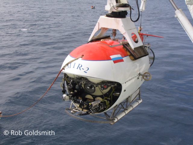 One of the crew hooks up an umbilical to the top of the submersible and the crane picks us up and gently swings us over the side of the ship. Even though I’d seen this procedure from on board the Keldysh, it was a whole different experience being inside the sub. Crew members pull on ropes to prevent the 18 ton Mir from getting a swing-on and banging into the Keldysh.