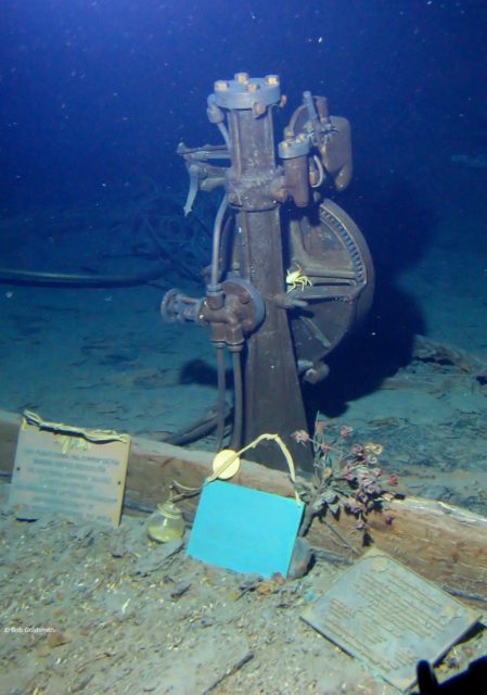 A single lifeboat davit lies near the stern section still in its open position, reminding us of that night. Like many items at the wreck site its brass turn screw looks almost new. One davit is partially buried, the other protrudes from the sea bed, the pulley still attached. Next to the davit sits a piece of piping from the stern section, crushed by the enormous amount of pressure. Near that sits a pulley from another davit.