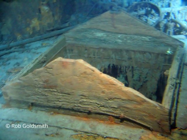 We continued our journey over the well deck then followed the path of the fallen mast. We glided gently over where the crows nest once was; unfortunately it fell off some years ago. The doorway is still clearly visible, as is the attachment for the ships bell just above it. We also found that the mast had broken just above the cargo hatch, which, as it transpired, was quite an important discovery.