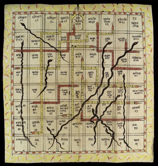 The game was associated with traditional Hindu philosophy contrasting karma and kama, or destiny and desire. The games have also been interpreted and used as a tool for teaching the effects of good deeds versus bad.