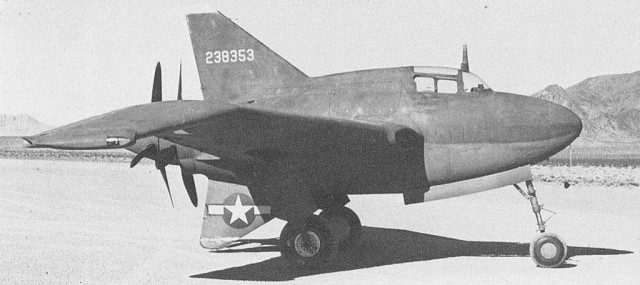 This idea for a single-seat plane started in 1939 as the Northrop N2B model. They designed it around the Pratt & Whitney liquid-cooled X-1800 engine in a pusher design driving contra-rotating propellers.