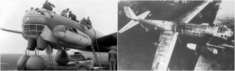 The first prototype had been intended to evaluate the idea. It was assembled from the fuselage of the HE 177 A-5, the tail of a Ju 388, the main undercarriage from the Ju 352, and also the nose wheels from a crashed B-24 Liberators.