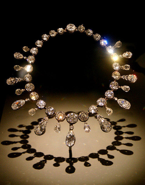 The stunning Napoleon Diamond Necklace was commissioned by Napoleon I of France c. 1811-1812. It consists of 28 mine cut diamonds set into a single thread, with a fringe of alternating pendeloque and briolette diamond cuts.