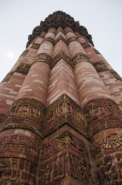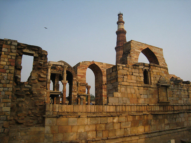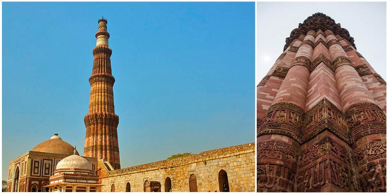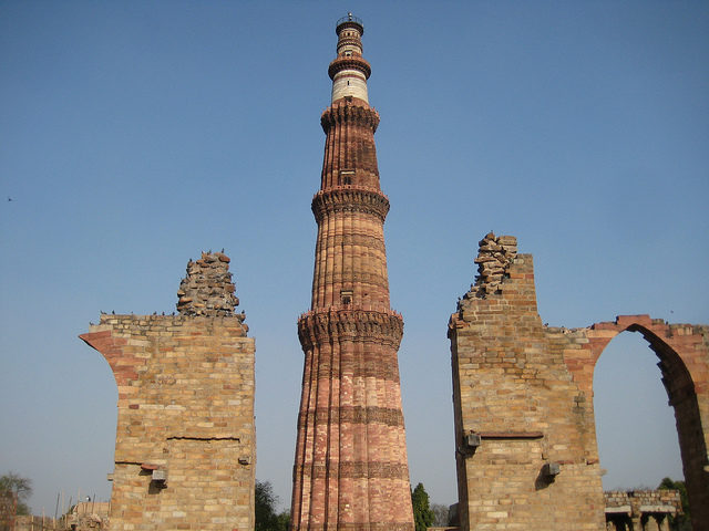 The Quwwat-ui-Islam Mosque is at the foot of the tower which is the first mosque to be built in India.