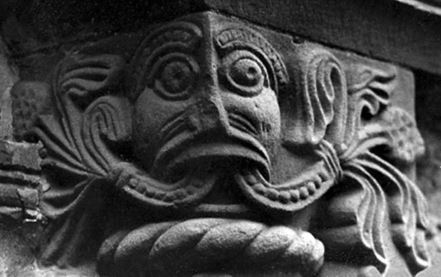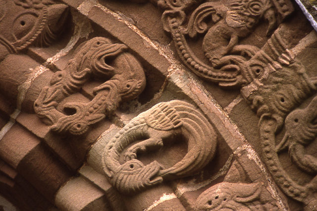 The carvings depict a plethora of symbolic imagery, including mythical beasts such as a basilisk and manticore, as well as actual birds, snakes swallowing each other’s tails, warriors, a tree of life, beasts, humans and on each side of the windows there’s a design of an interlaced snake topped by a “green man”.
