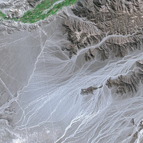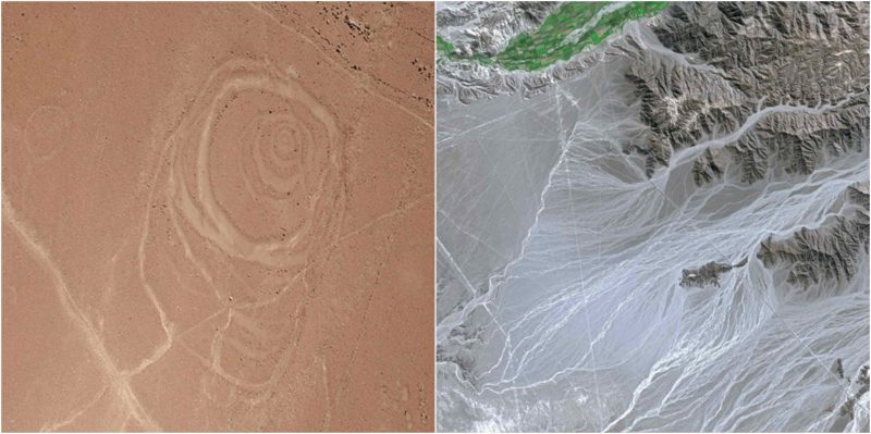 The most noted examples are located at a place known as Nazca, where there are thousands of designs  in geometric shapes and engraved into the Peruvian desert.