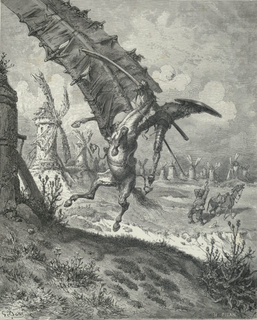 Besides all of this, Doré also managed to sustain the comic elements of the novel, something that many previous editions have neglected to do. Doré managed to illustrate the iconic windmill scene in an unusual fashion.