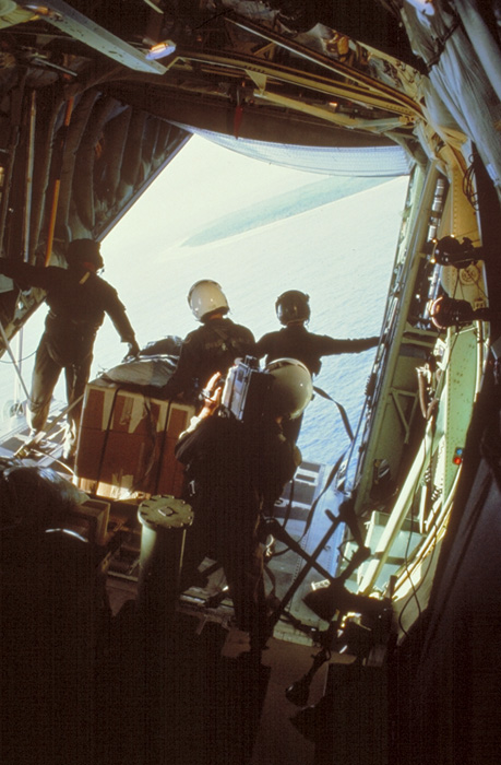 Each box dropped from a C-130 aircraft weighs nearly 400 pounds and contains many items that are very useful to the people that live on the islands, such as rice, canned goods, fishing nets, clothing, shoes, toys and more. By 2006, more than 800,000 pounds (360,000 kg) of supplies were delivered.