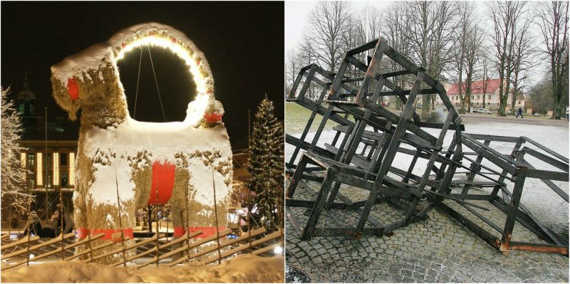 The Gävle Goat burning in 2001 was quite interesting. The figure was burned by a 51-year-old visitor from Cleveland, Ohio. He claimed that he wasn’t aware he was committing arson, but this didn’t matter much to the authorities in Gävle. He spent 18 days in prison and was sentenced to a fine of 100,000 Swedish kronor for the damage (which he didn’t pay). The court also took his lighter, telling him that he wasn’t responsible enough to carry one.