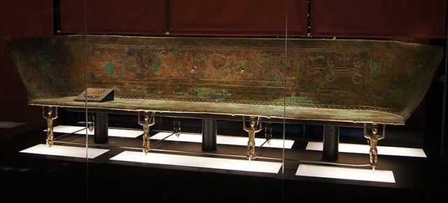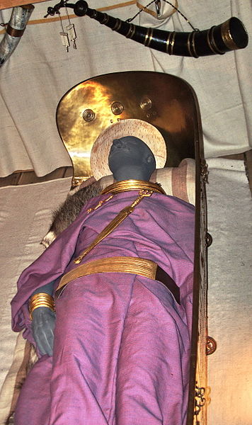 The entrance to the mound was to the north, and the mound was surrounded by a stone ring and oak posts. The east side of the tomb contained an iron-plated, wooden, four-wheeled wagon holding a set of bronze dishes – along with the drinking horns found on the walls, enough to serve nine people. The one reserved for the host was delicately decorated with gold, the tip being adorned with beads made of bones.