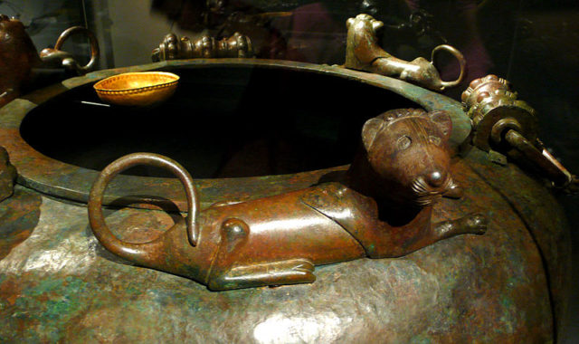 The gold coating made for the burial consisted of 16 parts, all precisely fitted onto the dagger without any fold. At his feet was a large bronze cauldron, filled with honey mead.