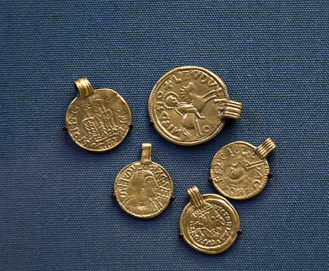 The manufacture of bracteates probably originated with Roman and Byzantine portrait medallions, presented by the emperor as gifts to important figures. Many of the bracteates feature ruler portraits of Germanic kings with characteristic hair that is plaited back and depictions of figures from Germanic mythology influenced to varying extents by Roman coinage while others feature entirely new motifs.