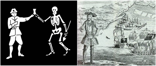 The American colonies were next on Black Bart’s list. He and his crew destroyed a harbor in Newfoundland and burned over 20 captured ships. Roberts and his crew captured ten French ships and commandeered one of them, fitting her with 26 cannons, changing her name in Royal Fortune, and then sailed it with his great black flag at the helm, which showed Black Bart standing, with cutlass uplifted, on two skulls, representing his dominance over the islands of Barbados and Martinique.