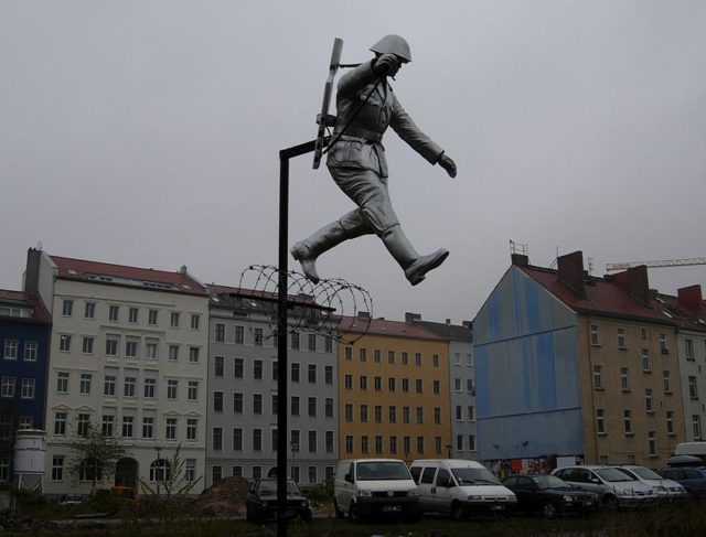 Florian and Michael Brauer and Edward Anders’ sculpture, called Mauerspringer (Wall jumper) could once be seen close to the site of Schumann’s defection but has since been moved to the side of a building on Brunnen Street, several meters south of Bernauer Street.