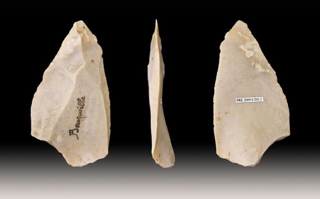 Tools made of stone and flint that have been sharpened to almost razor-like edges and pieces of bone which have been there anywhere from 180 thousand to 40 thousand years reveal that Neanderthals may have visited the site when the land masses were joined together before the English Channel appeared. Although glaciers covered the region at the time, the mouth of the cave would have been visible and accessible. The fact that the tools are from rocks not native to the area leads researchers to believe these early hominins traveled there across the ice taking several days to complete the trip on foot but did not stay for very long. Even after the ice receded it is believed that Neanderthals continued to visit the site for many generations.