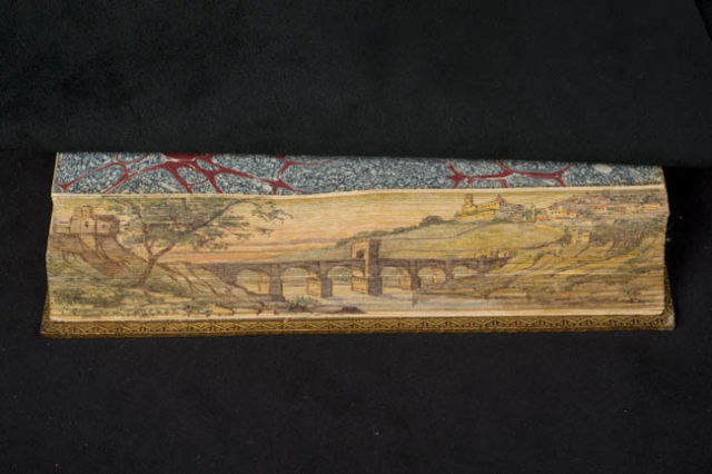 Fore-edge painting is the art of painting on the edges of the pages of a book. There are several different techniques: the most prominent one involves the artist painting the outer edges of the book so that the painting is visible only when the book is closed. Another technique, that features less frequently, is of the scenes painted on the outer edges of the pages inside the book, so paintings can be seen only when the book is open and the pages slightly folded.