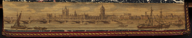 The earliest fore-edge paintings from the 10th century consisted mostly of symbolic and floral designs, and in the 14th century, they represented heraldic symbols and were done in color. The big boom of fore-edge painting emerged in the early 18th century in England, when it was popularized by John Brindley, publisher and bookbinder to the Prince of Wales.