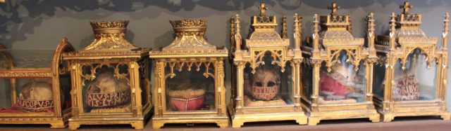 But whether it is 11 or 11,000, the walls of the Golden Chamber, or Goldene Kammer, of the church are covered in bones arranged in designs and letters along with relic skulls. In 1920, the church was granted the status of Basilica by the Pope.