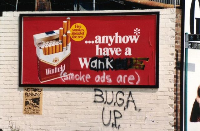 Since the late 1960’s, graffiti became a vital part of urban culture. On several occasions cultural movements were started by people who wanted to spread their message and used graffiti to publicly express their opinions. One such movement is the Australian BUGA UP, an acronym for “Billboard Utilising Graffitists Against Unhealthy Promotions”.