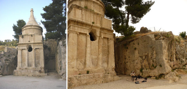 Although traditionally ascribed to Absalom, an analysis of the architectural styles used indicates that the monument’s construction and its first stage of use happened during the 1st century CE, one thousand years after Absalom’s death. It’s an example of Egyptian, Oriental, and Hellenistic architecture with the lower part built on a square base with vaults for burial chambers.
