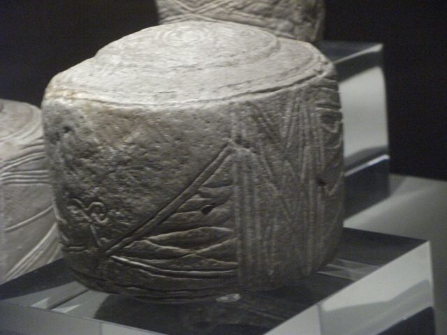 Dating from the Neolithic Britain, the Folkton Drums are three of the most remarkable decorated chalk objects in the shape of drums or solid cylinders. These objects were found in a round barrow on Folkton Wold, near Filey in East Yorkshire in 1899 by the amateur archaeologist Canon William Greenwell.